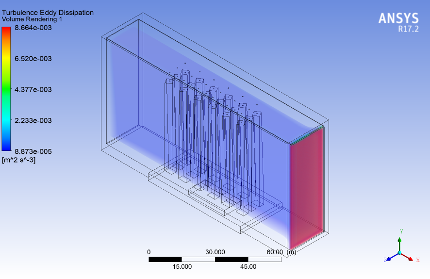 The results are presented as turbulence eddy dissipation contours as well as volume rendering.